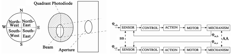 Around 2004, Roth developed a solar tracking system with a Pyrheliometer (an irradiance measuring instrument) used to direct solar irradiance measurements. The closed loop system consists in four quadrants of photodiodes (Figure 6(a)) to detect the position of the sun, where the DC motors were used to drive the platform instruments while keeping the irradiation in the center, between the four quadrants. Note that the cross coupling of AA and BB (Figure 6(b)) is virtually zero due to the arrangement of the orthogonal axis and the sensor’s parallel mounting [26] [27] .