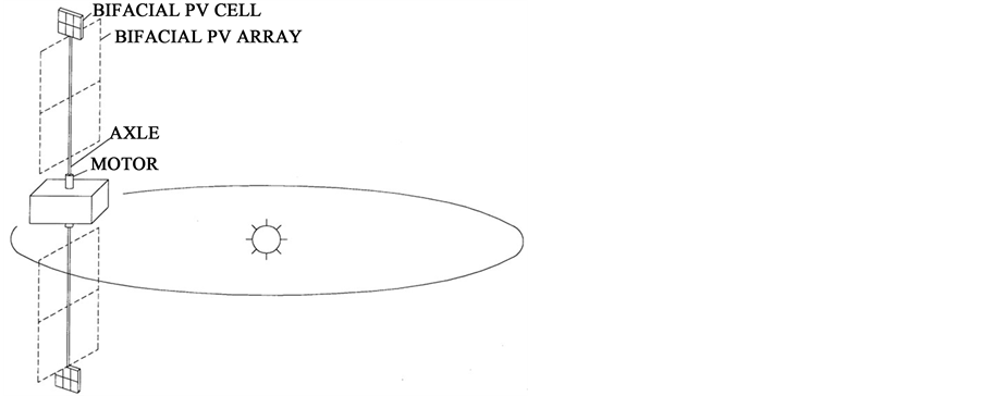 In 2005 Karimov has developed an axis tracking system with four PV modules installed on a rotor. PV modules were divided into two pairs and the angle between PV modules was of 170˚ (Figure 11) coupled in the bridge circuit, very similar to a Wheatstone bridge. If the output voltage from the modules is not equal, the voltage applied to the motor is not zero and, as a result, the engine begins to rotate. Research shows that for this tracking system, as opposed of the fixed PV modules, the output voltage in the evening and in the morning are not very different. This tracking system presents an increase in efficiency of 30% in energy production [42] .