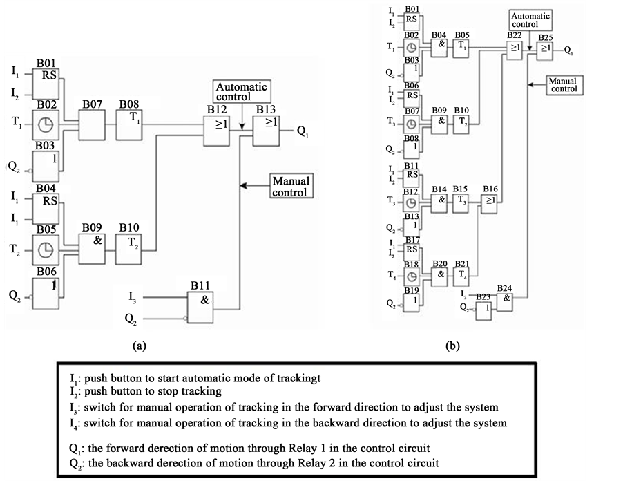 sensor consists of two photodiode elements divided by a vertical shading plate. Three touch-sensitive switches were mounted on the frame transmission gear to signal the end of course to control circuit. When performing tests for different inclination angles at different latitudes, it was concluded that the optimum angle is 50˚, independent of latitude. From the total energy calculation results, an increase in PV power generation of 24.5% was achieved, compared to PV fixed modules [29] .