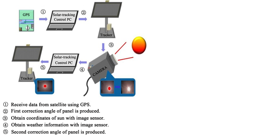 Yoo and Kang developed a solar tracking system using fusion of astronomical estimates through the use of GPS with the generated image processing through cameras. Figure 16 presents a conceptual diagram of the proposed tracking system.