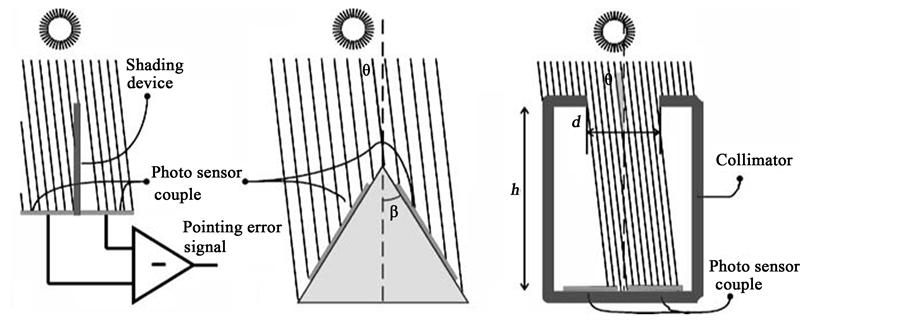 The closed loop circuits in tracking systems are based on the principles of control through feedback. In these systems, the number of inputs is derived from sensors, which detect relevant parameters of the sun and send them to a controller. The parameters are then analyzed by the controller which governs the “outputs”. In microprocessor tracking systems, with the use of electric-optical sensors, a different control signal (Figure 2(a)) is used to trigger the engine and to orient the PV modules in the direction light incidence over the electric-optical sensors becomes equal and balanced. Moreover, photodiodes can be mounted on inclined planes, aiming to increase the sensitivity of the photocurrent (Figure 2(b)). Often, in several applications, a shading device is presented as a tube collimator (Figure 2(c)) [18] .