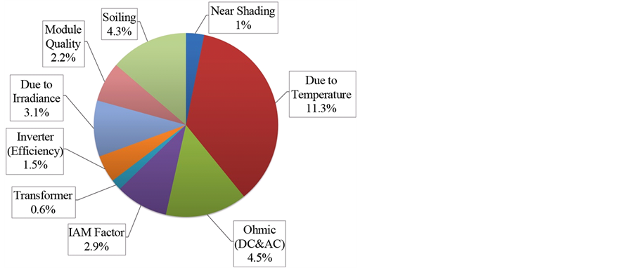 Figure 5. Energy loss profile based on near shading, temperature, irradiation, ohmic, IAM factor, transformer, inverter, soiling and module quality.