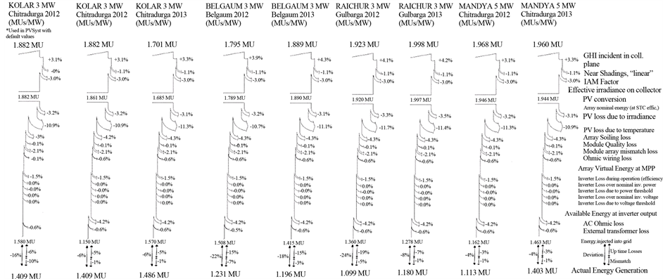 Figure 5 summarizes the validation of PV plant model with details, actual energy recorded at site, total input solar energy, simulated plant output, uptime losses (losses due to non-availability of grid, planned/un-planned shutdowns etc.) and deviation observed during model development and validation with different plant outputs for different years and for different locations.