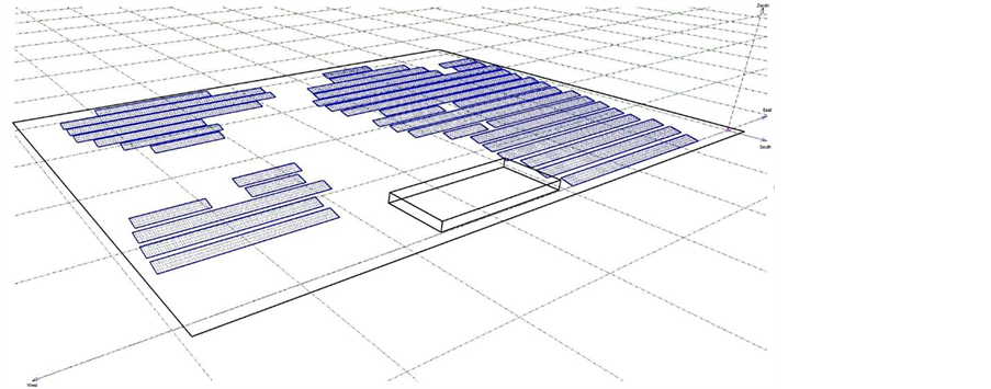 For simulation of energy generation weather data received from ground mount weather station at Chitradurga, for the year 2012 are used. For the development of first model, input losses are kept as it is, in PVsyst model (with default values). PVSyst output is 10.3% more compared to actual plant output. Design details with annual (%) loss due to soiling, cable losses and percentage uptime of the plant. Additionally, complete plant model is prepared using layout of the plant as obtained from Google Earth. Average distance between solar modules and inverter is about 36 m and it is about 40 m from inverter to transformer. All the details pertaining to all the four power plants like availability of grid, plant failure, plant layout etc. were confirmed by competent authority of KPCL. Google Earth image of the site is presented in Figure 2 whereas shading scenes prepared to simulate plant arrangement are presented in Figure 3 and Figure 4.