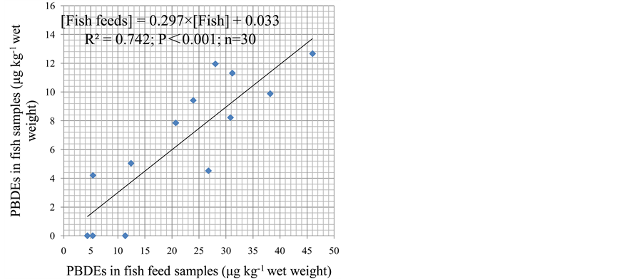 In order to discover whether there is a transfer for PBDEs between fishery products, the correlation of PBDEs between matching channel catfish and fish feeds were analyzed. The results indicated that there was significant correlation in PBDEs between matching channel catfish and fish feeds (R2 = 0.742, P < 0.001, n = 30) (Figure 2), suggesting that fish feeds contaminated with PBDEs possibly resulted in PBDEs residual in channel catfish through biological transfer.