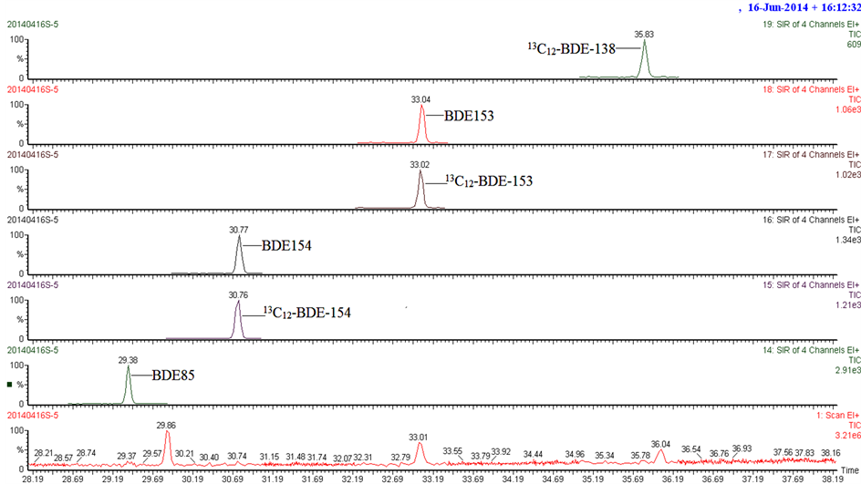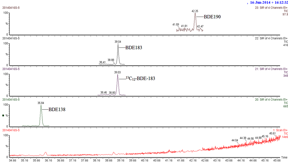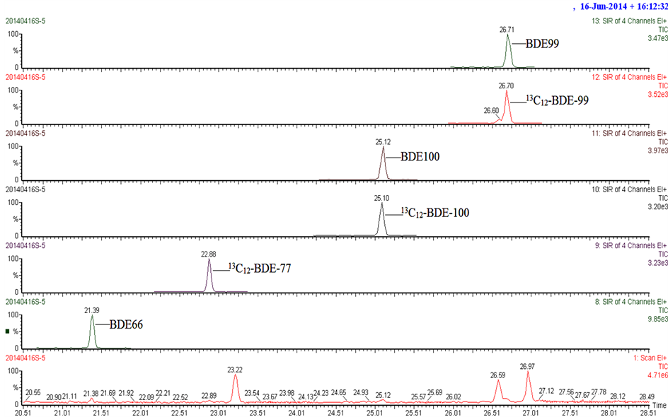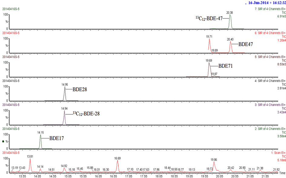 GC-MS chromatogram of a mixed standard solution of PBDEs and 13 C 12-labelled PBDEs (the concentration of BDE17, BDE28, BDE47, BDE66, BDE71, BDE85, BDE99, BDE100, BDE138, BDE153, BDE154, BDE183 and BDE190 were 100 ng∙mL−1, respectively, the concentrations of 13 C 12-labelled PBDEs 28, 47, 99, 100, 154, 153 and 183 as surrogate internal standard were 100 ng∙mL−1, respectively, and the concentration of 13 C 12-la- belled PBDEs 77 and 138 as syringe standard were 100 ng∙mL−1, respectively), was shown in Figure 1.