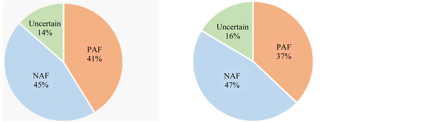 Figure 1. Ratio of the amount of PAF, NAF, and uncertain rocks. (a) Area I; (b) Area II.