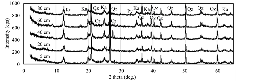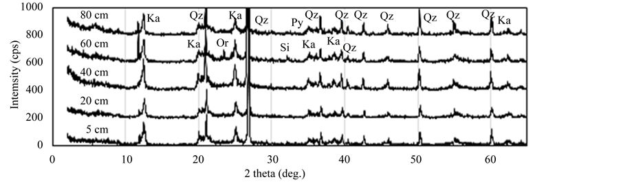 Figure 3. XRD patterns of rock samples at each depth in the waste dump. (a) Area I; (b) Area II. Ka: kaolinite, Qz: quarz, Or: orthoclase, Py: pyrite, Si: siderite.