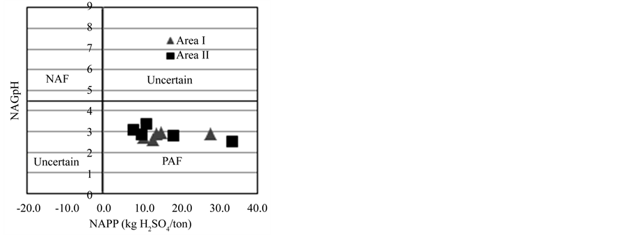 They were analyzed by ABA test and NAG test to classify them into PAF or NAF by following the standard [6] [8] . ABA test was proposed in 1974, and it was modified by Sobek et al. in 1978 [6] . Acid Potential (AP) is calculated based on the sulfur content in samples, and Acid Neutralizing Capacity (ANC) is determined as kg H2SO4/ton by titrating with NaOH. Finally, Net Acid Producing Potential (NAPP = AP − ANC) is calculated with the results as the net value of AP and ANC. NAG test which was proposed in 1978 considers the maximum potential of acid production in rocks [6] . The potential is determined based on the change of pH in the solution when samples are dissolved by forced oxidation with H2O2: the pH is reported as NAG pH. NAG pH and NAPP are plotted on graph to classify rocks into PAF or NAF [6] [7] . This classification was performed with the samples based on the results in this study. Besides, the amount of PAF and NAF in pit in area I and II was calculated as the ratio of the length of each representative sample to total length of them and with the result of classification.