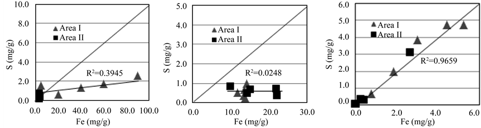 Table 1. Average amount of each form of Fe and S in area I and II.