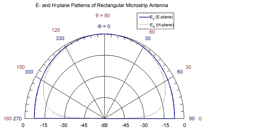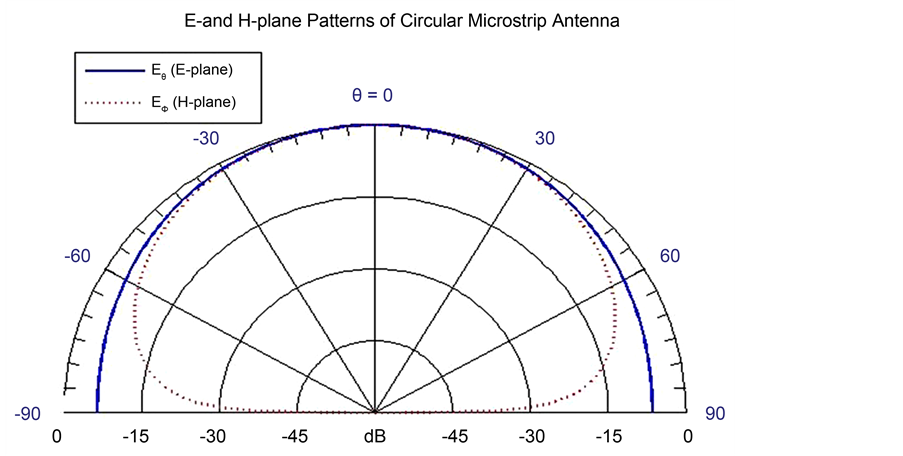 is the second order Bessel function, ae is the effective radius. In order to compare the field patterns for circular microstrip antenna with those of rectangular microstrip antenna we maintain the same metallic surface area. We also maintain the same substrate height. Plots of the E-plane and H-plane field patterns for the circular microstrip antenna of same area are shown in Figure 6. The other parameters used to produce the field patterns are as follows: effective radius ae = 0.5985 cm, the E-plane HPBW = 92˚ and the H-plane HPBW = 78˚, the directivity is 5.5272, the input resistance at feed point is 228 Ω.