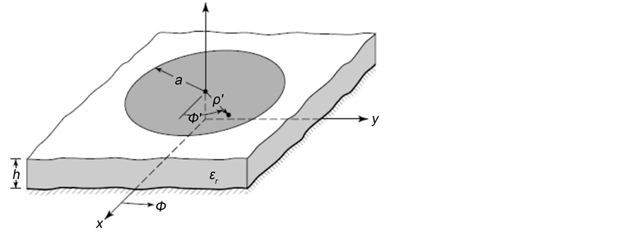 A circular microstrip antenna is shown in Figure 5. The construction of a circular microstrip antenna is similar to that of a rectangular microstrip antenna. Only the shape of the metallic strip is circular rather than rectangular.