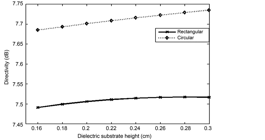 The directivity of circular microstrip and rectangular microstrip antennas are illustrated in Figure 7 and Figure 8. It is shown in Figure 7 that directivity variations for both investigated antennas are not much different when different dielectric materials are used. But, the directivities vary with respect to the height of dielectric material as shown in Figure 8. This figure depicts that the circular microstrip antennas achieve high directivity compared to its rectangular counterpart. Hence, we consider circular microstrip antenna for the rest of the work presented in this paper.