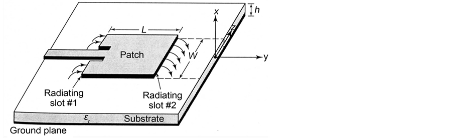 A rectangular microstrip antenna is shown in Figure 2. It consists of a very thin metallic strip placed on dielectric substrate. The thickness of the microstrip is usually less than free space wavelength (i.e., λ0 = c/f) and the substrate thickness varies between 0.003λ0 and 0.05λ0. The rectangular strip is placed on the substrate in a way so that the maximum antenna radiation occurs along the direction that is normal to the microstrip. The length of the microstrip, L varies between 1/3λ0 to 1/2λ0. A number of dielectric substrates, with the dielectric constant, ϵr from 2.2 to 12, are used in microstrip antenna.