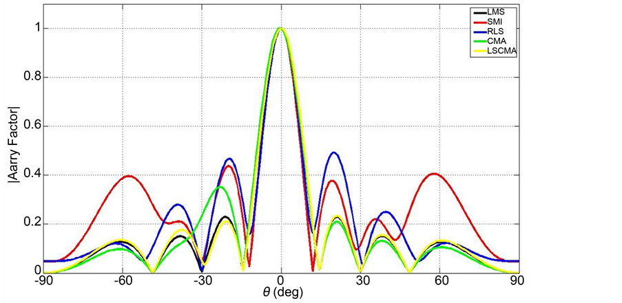 In order to investigate the performances of the above mentioned smart antenna algorithms namely LMS, SMI, RLS, CMA and LSCMA we design a linear antenna array consisting of 8-elements. The antenna elements are separated by a distance of λ/2. The desired signal is arrived at θ = 0˚ and the interfering signal is arrived at θ = −30˚. We assume the desired signal is purely sinusoidal with period 1 mS. The radiation patterns for these algorithms are illustrated in Figure 11. The antenna array is operated in a noisy environment. We assume the noise is Gaussian with mean 0 and standard deviation 1. It is depicted in the figure that all the investigated algorithms generate a maximum radiation patter in the desired direction (i.e., θ = 0˚). It is also depicted that all the algorithms generate null at the interfering signal (i.e., θ = −30˚) except CMA algorithm. The CMA algorithm only attenuates the signal, but it fails to nullify the signal. In terms of side lobe amplitude, the LMS and LSCMA algorithm performs better compared to other three algorithms. The RLS algorithm produces maximum side lobe. The side lobes attenuate very quickly except SMI algorithm. The side lobe reduces to 0.1 for the SMI algorithm, but the same increases to 0.4 again. Although the LMS and LSCMA show similar performance in terms of side lobe minimization, the LSCMA should be used in the ad hoc networks because of its rapid convergence property compared to its LMS counterpart.
