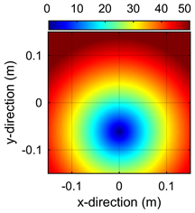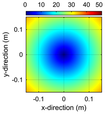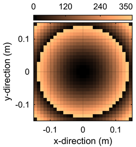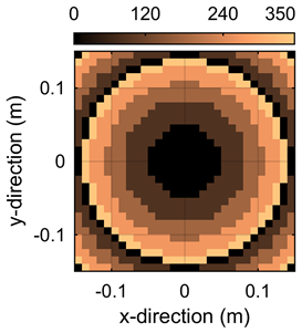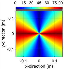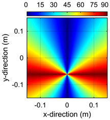 For a precise design, the effects of excitation angle (θinc, φinc) for each element ought to be considered. Figure 8 displays the range and distribution of plane wave excitation angles in the RA aperture. It can be observed that the upper part of the RA aperture has a maximum θinc. So, the element spacing should have selected small enough that no distributed grating lobe radiated [1] . Comparison of Figure 8(a) and Figure 8(b) indicates that the percentage of aperture area illuminated with incident angle larger than 30˚ in the central case is less than 5.6% whereas in offset-feed RA is about 66.7%. Therefore, the impact of incidence angle is anticipated to be more significant in offset fed RAs. So, the use of sub-wavelength element appears to be necessary [13] . In the RA design process, an excitation plane wave can always be decomposed into a combination of the zero TE- and TM-waves [1] . In [14] , it is indicated that magnitude of reflection components depends on both the θinc and φinc, and it ought to be considered for every element.