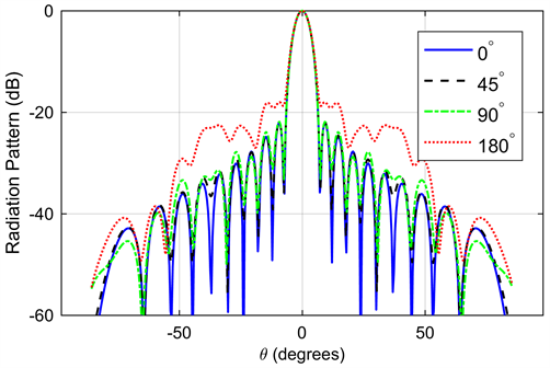 Element dimensions can be determined by the phase versus element change curve, when the necessary phase shift for each element is computed. However, element dimensions vary by a discrete value associated with the fabrication resolution, therefore, a sustained phase control is impossible. The discrepancy between desired element phase and quantized phase of the chosen element is classified as quantization-phase error. In this section, a study is undertaken to investigate the effects of quantization-phase errors on SLLs, HPBW and ηa. A broadside center-fed 30 cm square RA with sub-wavelength unit elements (lambda/3 at 10 GHz), rf = 1, qf = 8.2, and qe = 0.85 is used in this study. The feed and element patterns are respectively modeled by the and due to its simplicity. Figure 4 shows the phase distribution of the RA aperture at the ideal and various quantization phase, 45˚, 90˚ and 180˚ equal to 3-, 2- and 1-bit(s), respectively. Figure 5 shows the radiation pattern which calculated by array-theory method [10] .