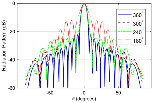 Sub-wavelength single resonance phasing elements have a phase-range below 360˚. So, some elements have unachievable phase shift. The radiation patterns for various element phase-ranges of 30 cm side-length square RA with θo = 0˚, θb = 0˚, rf = 1, qf = 8.2, and qe = 0.85 are represented in Figure 5(b). As can be observed from Figure 5(a) and Figure 5(b), no grating lobe appears due to the pseudo-random distribution of phase errors [11] . These effects are compared in Table 3 and Table 4. It is noticed that these errors increase SLLs, but have no major effects on the HPBW. Even the 45˚ quantization-phase or 180˚ phase-range cases has similar HPBW as RA with ideal phases. It can be a very helpful to cut back to the system complexity and cost, when the HPBW is a major demand.