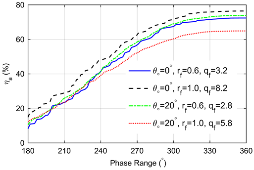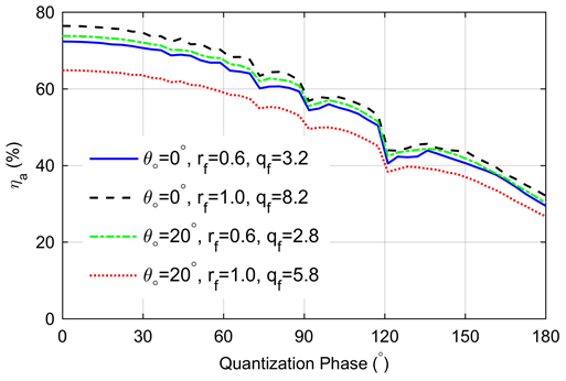 A parametric study has been performed for center- and offset-fed square aperture RA, with side length 30 cm, λ/3 element spacing at 10 GHz, qe = 0.85, x˳ = 0 and yo = 0, with different rf, for each case qf is considered to be maximum ηa. In this study, the offset-feed and main beam angles are equal. The ηa is derived from gain value [12] , which includes ηspill, ηph and ηt. In Figure 6, the acceptable quantization-phase without ηa reduction is around 30 and the threshold for phase-range is around 300˚. It shows reduction of ηa depends on quantization-phase or phase-range values, however, it is independent of offset-angle and feed location. The ηa reduction occurs when the SLLs is increased which in turn causes gain loss.