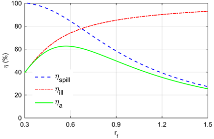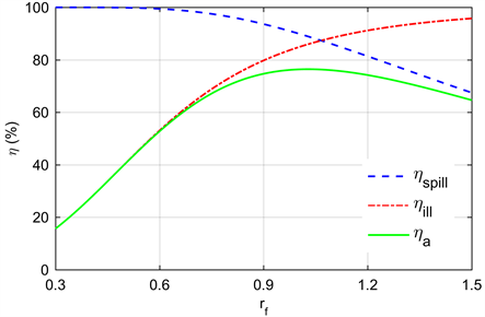 Figure 7. ηill, ηspill, and ηa for square aperture. (a) θo = 0˚, qf = 8.2; (b) θo = 20˚, qf = 2.8.