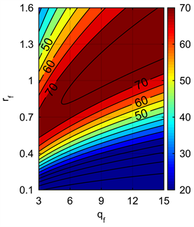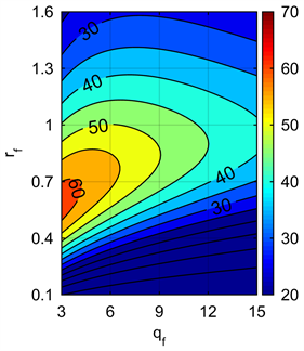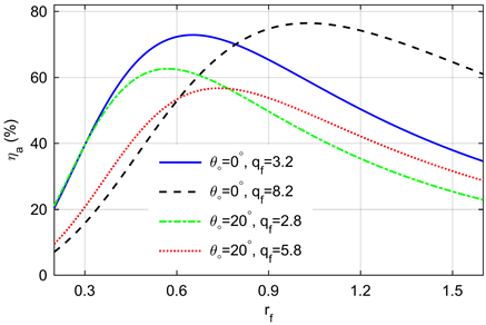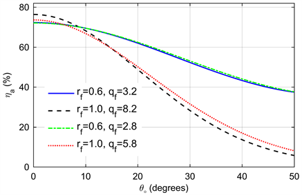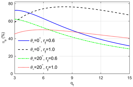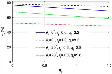 Figure 9. The ηa for square aperture versus both qf and rf.(a) θo = 0˚; (b) θo = 20˚.