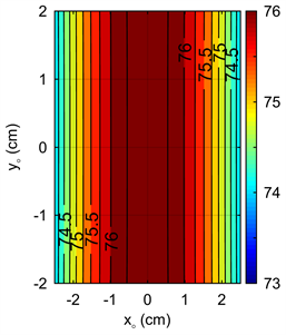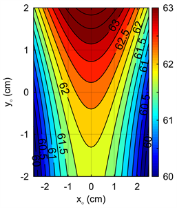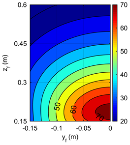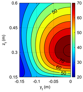 placed in y-z plane, the plane of incidence, it is proper to use the coordinate (yf, zf) for parametric study. The results are displayed in Figure 10(a) and Figure 10(b) for qf = 2.8 and qf = 8.2, respectively, other fixed parameters are: xo = 0, yo = 0, and qe = 0.85. It is noted that once qf = 2.8, ηa is varied from 60% to 70%, and when qf = 8.2, the maximum ηa is achieved at higher feed position. Larger qf value yields a narrower feeding beam width. So, a larger rf ought to have an additional uniform field distribution on the aperture. Using this contour map, one might find a correct feed location. The maximum ηa is acquired close to zf = 290 mm, as determined in Figure 10(b). The ηa keeps nearly constant until yf is shifted to -50mm with zf fixed in 297 mm.