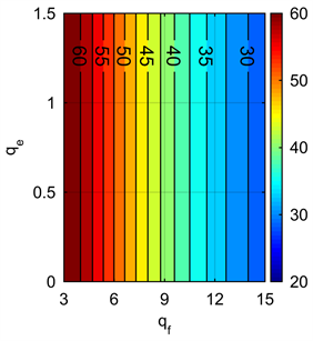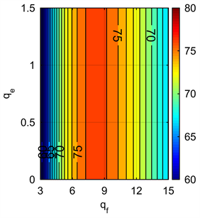 The contoured ηa plot versus xo and yo are depicted in Figure 11, with the fixed parameters: rf = 1.0, θo = 0˚, qf = 8.2, and qe = 0.85 for center-fed; rf = 0.6, θo = 20˚, qf = 2.8, and qe = 0.85 for offset-fed RA. It is noted that for offset case maximum efficiency is obtained once the feeding beam is pointed at 13 mm away from aperture center, when ηa reaches 63%. Besides, the symmetry of the ηa with respect to x-axis is observed. In most RAs xo = 0, and yo = 0, therefore center elements have a stronger illumination and contribute more to total radiation. Accordingly, the useful information of an RA performance can be deduced without simulating whole structure. For example, a decent approximation of the RA gain bandwidth can be estimated by calculating the scattering from the middle row of a large RA enclosed by perfectly magnetic conductor (PMC) boundaries [15] . For gain bandwidth enhancement, one might place elements with smaller reflection loss at the central area of the aperture. This can be done by adding a phase constant to the phase distribution over the RA aperture. Considering both qf and qe results a contour plot of ηa in Figure 12 with constant parameters: rf = 1.0, θo = 0˚, xo = 0, and yo = 0 for center-fed; rf = 0.6, θo = 20˚, xo = 0, and yo = 0 for offset-fed. Note that the parameters qe solely effects ηill. Figure 12(a) and Figure 12(b) show the fact that the qe plays a smaller role in the ηa than qf.