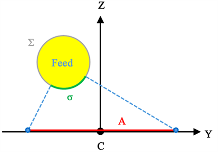 Figure 1 shows a typical configuration of a square RA system consist of an array of radiating elements and a feeding source. As demonstrated in Figure 1, four sets of coordinate systems are usually employed to analysis an RA. The subscript f points out the feed coordinates where is the location of feed phase center. In Figure 2 the feed beam direction (FBD) is marked by Po(xo, yo, 0) where the maximum radiation of the feed horn is directed. The θo and θe are offset-angle of feed source and incidence-angle of mnth element, respectively. The system configuration parameters are listed in Table 1. In Figure 3 Σ points to the spherical surface centered at feed phase center. A shows the RA aperture that is specified by the aperture boundary, and surface σ shares a similar angle with A and Σ [7] .