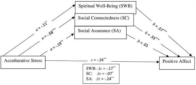 The results of mediation analyses with spiritual well-being, social connectedness and social assurance as three mediators between acculturative stress and positive affect are shown in Figure 1. As indicated in Figure 1, there is a significant mediation effect of spiritual well-being (Sobel z = −1.61, p < .05; Δc = −.17, p < .01) and social connectedness (Sobel z = −4.57, p < .001; Δc = −.07, p < .05) in the relationship between acculturative stress and positive affect. Using Preacher & Kelly’s (2011) formula, ab/ab + Δc, the mediation effect size is .27 and .73, respectively. That is, 7% and 53% of variation in the relationship between acculturative stress and positive affect is accounted for by spiritual well-being and social connectedness, respectively. Social assurance didn’t show a significant mediation effect in the relationship between acculturative stress and positive affect.