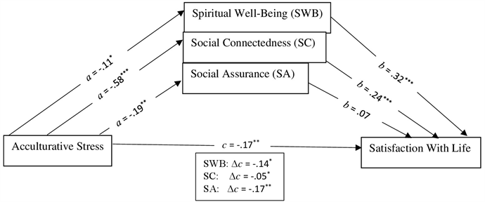 Figure 2. Mediation Effects of SWB, SC, and SA on the Relationship between Acculturative Stress and Satisfaction with Life. N = 214; p*** < .001, p** < .01; p* < .05. All the values are standardized coefficients.