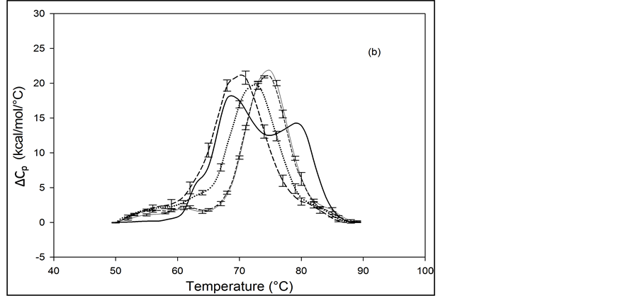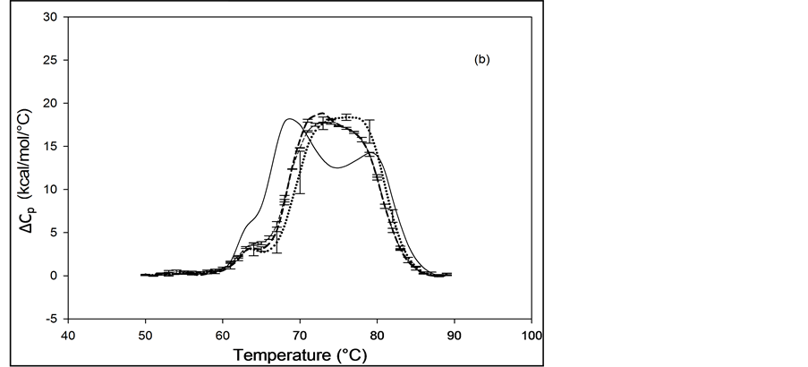 More sophisticated models that include the possibility of multi-state transitions and a non-zero ΔCp have been applied to analyze DSC measured denaturation curves of HSA and provided evaluations of thermodynamic transition parameters [1] [13] . Obviously depending on specific features of the particular analytical model employed to analyze DSC thermograms, actual values of the thermodynamic transition parameters obtained from the analysis could differ. However, relative values of the evaluated parameters should provide a more consistent basis for comparisons of results obtained using different models for thermogram analysis.