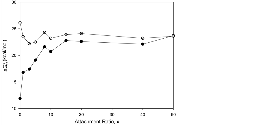 Figure 5. tm versus attachment ratio for HSA96-NS(x:1) (open symbols) and HSA99-NS(x:1) (filled symbols). For HSA96-NS(x:1) tm also approaches 75˚C at higher x values, but does so more slowly than HSA99-NS(x:1).