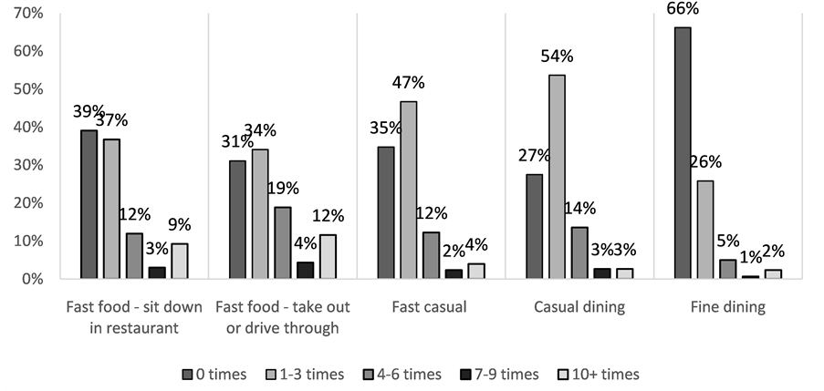respondents were asked the average number of times they visited different restaurant types (Figure 1). Restaurant types presented to respondents were: fast food/sit down in restaurant, fast food/take out or drive through, fast casual, casual dining, and fine dining. Most pertinent to this study was people’s fast food consumption habits. With respect to fast food/sit down in restaurant eating, the largest portion of respondents, 39%, claimed they did not eat