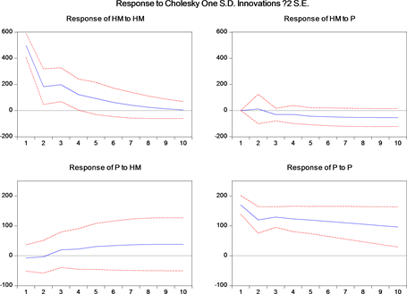 impulse response method which depends on VAR model is used to give a positive unit size impact on international short-term capital HM, and an impulse response function graph about real estate price P is obtained.