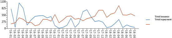 From Figure 2, we can see the change trend of total issuance and total repayment of the corporate bonds during recent years. Due debt repayment of financing platforms is under great pressure. If it cannot be raised in time, the risk of default will occur.