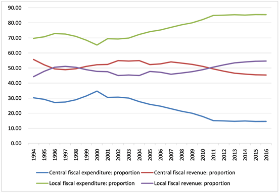 Figure 4. The distribution of revenue and expenditure rights between central and local. Source: Wind.