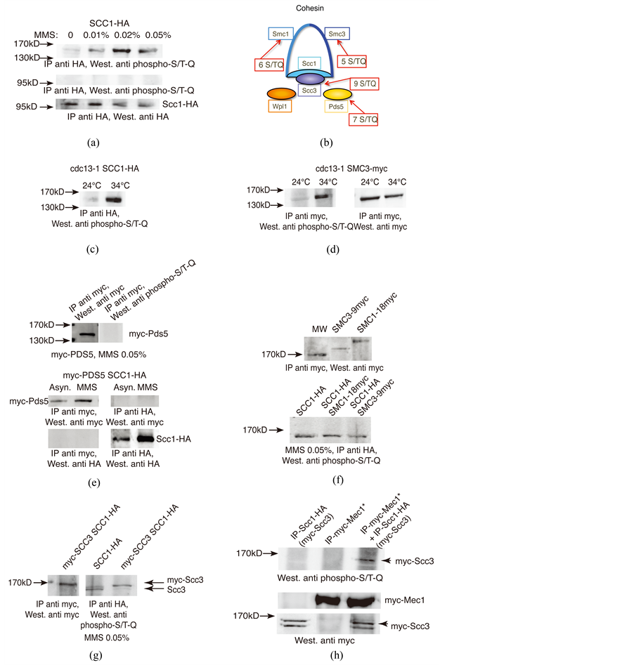 It was formally possible that the phosphorylated protein was not Scc3 but rather Pds5 because the established strong binding between the two proteins (see for instance ref. [23] ). However, the absence of co-immunoprecipi- tation of Myc2-Pds5 by Scc1-HA2 and vice versa (Figure 1(e)) strongly argued that Pds5 was not the Scc1- HA2-attached S/T-Q phosphorylated protein.
