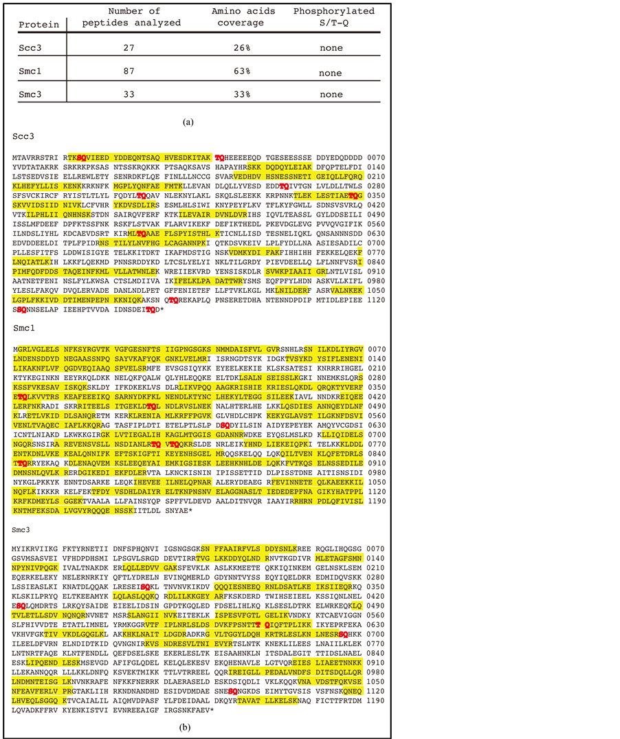 Figure 2. Mass spectrometry analysis of the anti-P-S/T-Q antibody reactive cohesin band. The acrylamide gel band corresponding to the P-S/T-Q signal was cut out after superimposing with the reactive nitrocellulose transfer membrane of another gel run in parallel and subjected to trypsin digestion followed by mass spectrometry analysis. Smc1, Smc3 and Scc3 peptides were detected in this band. (a) Summary of the results; (b) Amino acid sequences of Scc3, Smc1 and Smc3 showing in yellow the peptides recovered after trypsin digestion (from the same experiment as in (a) and analyzed, and, in red, the amino acids of the S/T-Q type. The coverage of Scc3 sequence following trypsin digestion was rather low, 26%, thus rendering identification of the residues phosphorylated upon DNA damage very difficult.