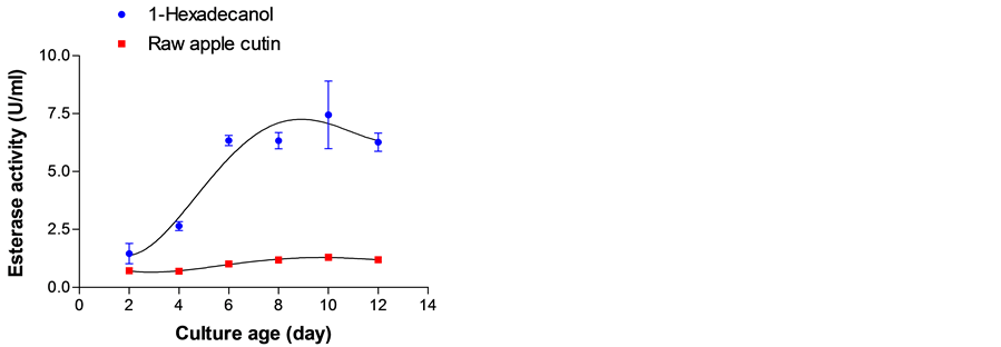 Figure 6. Effect of 1-hexadecanol on esterase activity measured in the F. oxysporum culture medium. Fungal colonies were grown on 20 ml mineral medium containing 0.1% glucose (as in Figure 1) for 4 days until the glucose in the medium was consumed. Then, 2 ml inoculum from this preliminary culture was transferred to 250 ml Erlenmeyer flasks containing 20 ml mineral medium and 100 mg raw apple cutin powder or 200 mg 1-hexadecanol.When 1-hexadecanol was used as a carbon source, the flasks were autoclaved prior to the insertion of the inoculum and cooled in a rotary shaker at 200 rpm after the addition of 0.5% Tween 80 in order to suspend the 1-hexadecanol in the medium. The shallow cultures were grown at 23˚C without shaking for 12 days. Values represent the average of three measurements. Bars indicate standard deviation. Esterase activity unit definition is as in Figure 1.