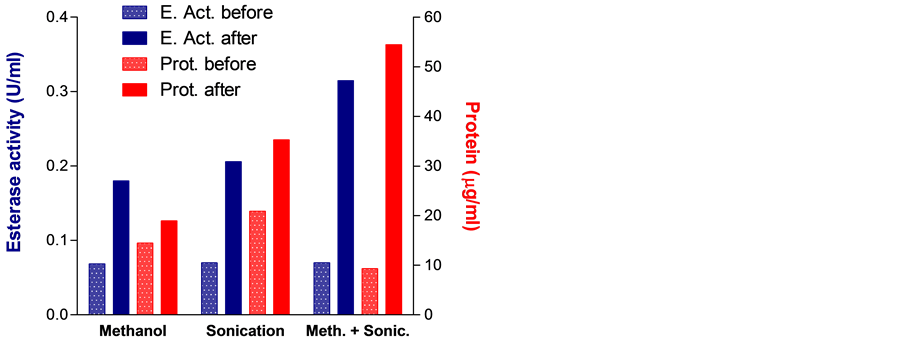 The cutinase enzyme tends to form hydrophobic interactions with the F. oxysporum mycelium and the cutin components in the culture fluid. This led to low yield when extracting it from the medium. Thus, in order to achieve higher concentrations of cutinase from the culture media, the release of the adhering enzyme was carried out by rinsing the rough solid residues twice with 2 ml 10% methanol and then several times with 2 ml DDW each. This procedure successfully led to the release of the adhering enzyme to the rinsate, especially after the first rinsing that led to an over 17% elevation in enzyme activity in the rinsate (data not shown). Alternatively, the cultures were incubated with methanol (10%) for 1 h as a sole treatment or in combination with sonication (3 × 30 sec, continuously), as demonstrated in Figure 7. The combined treatment led to a very significant (>500%) increase in total protein and esterases activity measured in the rinsate (Figure 7).