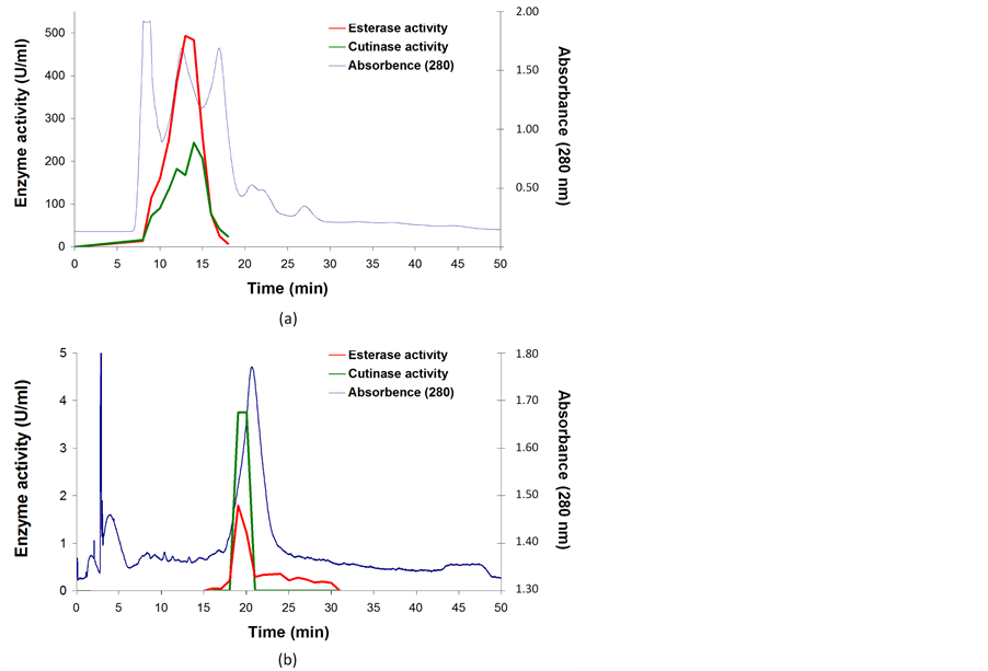 The crude enzyme from the F. oxysporum culture extracellular fluid was purified with HPLC (Waters 600E) equipped with a spectra-physics detector (280 nm) and a fraction collector, and assayed for cutinolytic activity. The initial purification step of the extracellular cutinase was done with a Superdex 200 column, which is able to separate between proteins in a mass range of 10 - 600 kDa, with isocratic flow (1 ml/min) of potassium phosphate buffer (50 mM, pH 8). The fractions collected every 1 min (for 45 min) were examined for esterase activity (with p-nitrophenyl butyrate) and cutinase activity (with the pNMSEH cutinase substrate) (Figure 8(a)). The fractions exhibiting cutinase activity (12 - 14 min) were combined, concentrated by ultrafiltration, centrifuged and injected into an anionic Mono Q column (FPLC) with Tris buffer (50 mM, pH 8) and 0-1 M NaCl gradient for 40 min. The fractions exhibiting cutinase activity (10 - 11 min) were injected into the same anionic Mono Q