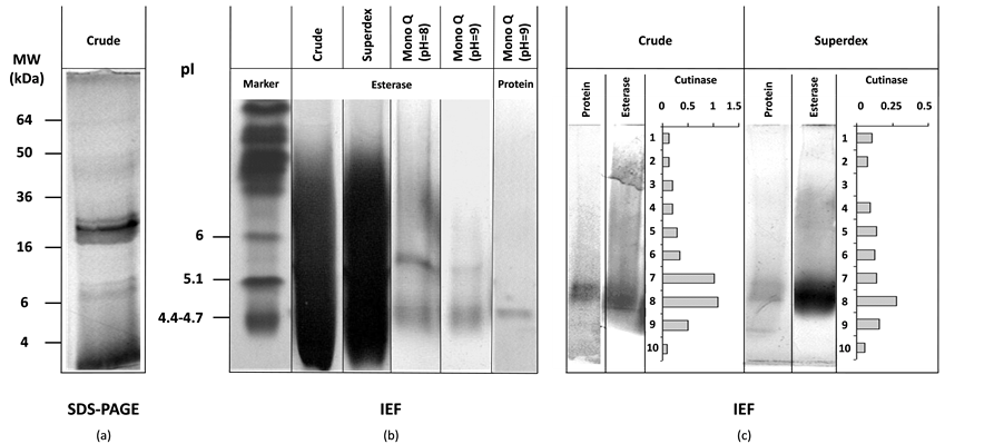Samples from the three purification steps were analyzed using SDS-PAGE and IEF (Figure 9), and the molecular weight of the purified enzyme was estimated based on protein standards used as molecular weight markers. The cutinase protein band was already clearly identified in the crude (Figure 9(a)). Further purification revealed that from the extracellular fluid of F. oxysporum cultures, a cutinase with a molecular weight of about 20 kDa and an isoelectric point of 4.7 were isolated (Figures 9(b)-(c)).