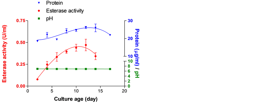 Figure 1. Changes in esterase activity, protein concentration and pH in the growth medium during the growth of the fungi Fusarium oxysporum on a mineral medium [6] containing raw apple cutin. Suspensions of the fungus mycelia (2.5 ml) were added to 90 ml mineral medium containing 0.1% glucose and inoculated in a Fernbach flask for three days until the glucose was exhausted. Then, 2 ml of the inoculum was added to a 250 ml Erlenmeyer flask containing 16 ml mineral medium containing 100 mg raw apple cutin powder instead of glucose. The cultures were kept at 23˚C without shaking. Values represent the average of three measurements. Bars indicate standard deviation. One unit of esterase is defined as the amount of enzyme required for the release of 1 micromole p-nitrophenol per ml per min.