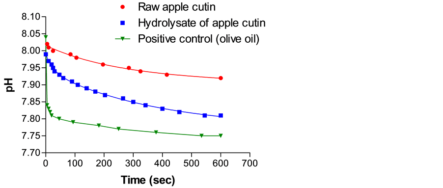 Figure 2. pH drop as a result of cutinase activity with various substrates. Twenty-five mg raw apple cutin or 1.4 mg hydrolysate of apple cutin (prepared with hot alkaline ethanol-KOH in a reflux system) or 1.4 ml olive oil (positive control) were incubated with 0.04 U/ml cutinase (produced by Pseudomonas mandocino obtained from Inter Spex Products Inc., California, USA) in 5 ml solution containing 0.04% Triton® X-100 and 20 mM potassium phosphate buffer pH 8. The reactions were carried out at room temperature. The experiment was repeated three times, and all the results were the same as the one shown here.