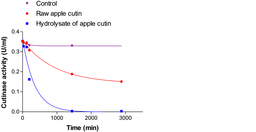 Figure 3. Reduction in residual cutinase activity in the presence of raw apple cutin and hydrolysate of apple cutin. 3.53 U/ml cutinase (produced by P.mandocino) were incubated with 50 mg raw apple cutin or apple cutin hydrolysate in 5 ml solution containing 100 mM potassium phosphate buffer, pH 8 and 0.04% Triton® X-100 at 37˚C. The control test tube was incubated under the same conditions with no substrate. Cutinase residual activity was measured at the indicated time using specific cutinase substrate, 4-nitrophenyl (16-methyl sulfone ester) hexadecanoate (pNMSEH) [26] . Values represent the average of two independent replications. One unit of cutinase is defined as the amount of enzyme required for the release of 1 micromole p-nitrophenol per ml per min.