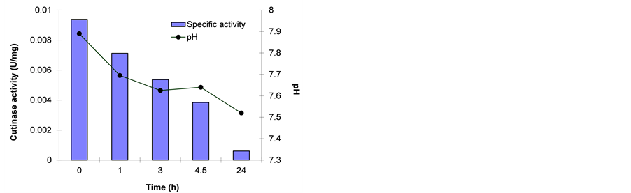 Figure 4. Changes in pH values of the solution and cutinase specific activity over time in the presence of apple cutin hydrolysate substrate. Cutinase (3.53 U/ml, produced by P. mandocino) was incubated with 1.4 mg cutin hydrolysate at 37˚C in 5 ml solution containing 20 mM potassium phosphate buffer, pH 8 and 0.04% Triton® X-100 for the indicated times. Values represent the average of two independent replications. Cutinase activity unit definition is as in Figure 3.