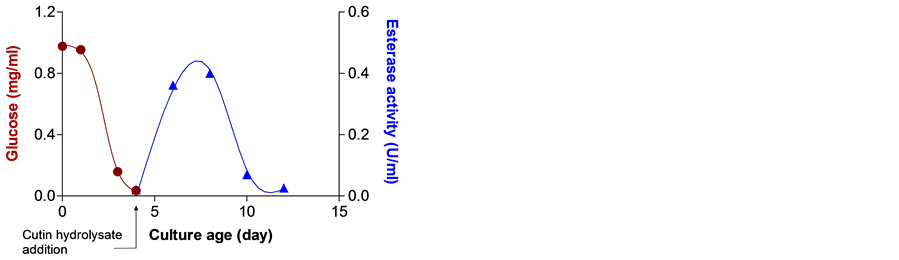The aim of this study was to optimize these varieties as part of the continuous scientific effort to establish the production and use of cutinase for biotechnology purposes. Moreover, the search for cutinase inducers other than cutin, which is expensive and difficult to obtain on a large scale, is an important step when considering the viability of industrial fermentation for the preparation of fungal cutinases for commercial applications. Cutin or cutin hydolisate from apple fruit and a C16 alcohol (1-hexadecanol) were used to induce cutinolytic esterase activity during saprophytic growth of F. oxysporum (Figure 1, Figure 5, Figure 6). A similar technique was used to evaluate other phytopathogens for their potential use for cutinase production [35] . Indeed, these substrates cause a peak on day 8 - 12 (some variations occur depending on the carbon source) of growth in the cutinase production, measured by a specific, recently developed pNMSEH cutinase assay [26] .
