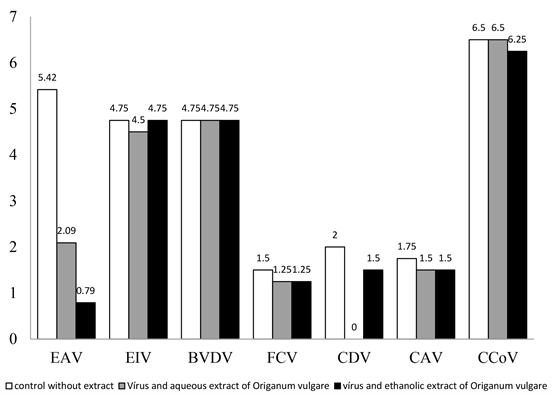 Figure 1. Titers (TCID50/100 µL) of EAV, EIV, BVDV, FCV, CDV, CAV and CCoV in absence or presence of aqueous extract (1600 µg/mL) or ethanolic extract (600 µg/mL) of Origanum vulgare.