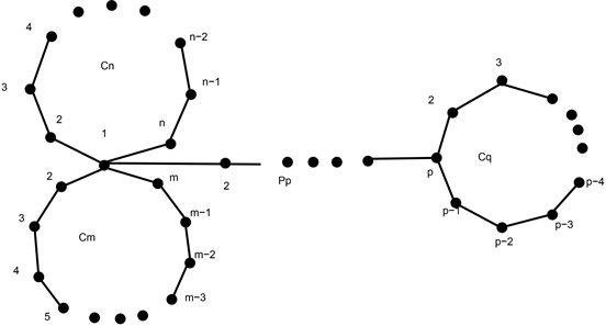 Let G be a connected graph of order n, the graphs respectively with size , n, and are called the tree, the unicycle graph, the bicycle graph and tricyclic graph. , the vertex-induced subgraph is the subgraph of G whose vertex set is U and whose edge set consists of all edges of G which have both ends in U. denotes the graph . Let G and H be two vertex disjoint graphs; denotes the union graph of G and H. As shown in Figure 1, a graph consisting of two endpoints of a path bonded to circle , and is called ζ-graph (as ). As known to all, the tricyclic graphs can be divided into 15 categories: γ = {all tricyclic graphs that contain an induced subgraph ζ-graphs} is one category of the 15 categories. For a given tricycle graph , the only induced subgraph ζ-graphs is called the kernel of graph G, as .