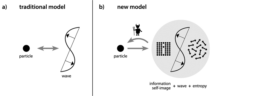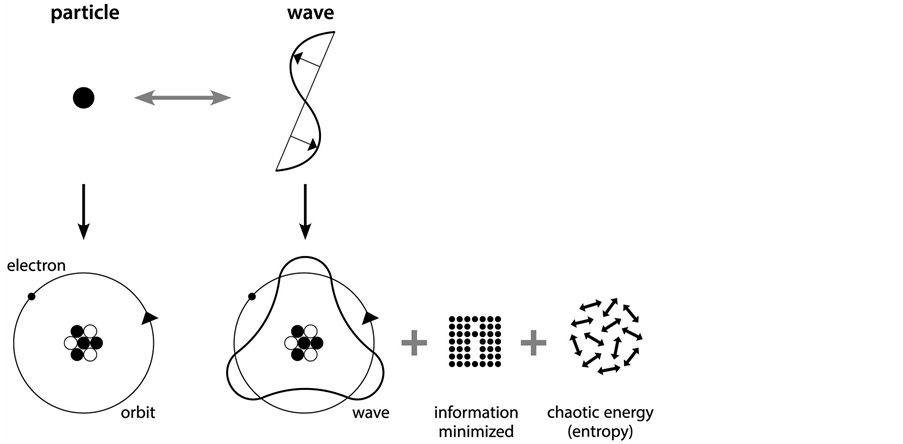 assembles a three-dimensional object via pure information. This is required to provide reversibility of particle- wave inter-conversion within the particle-wave duality in a fundamentally oriented world. When the particle contains sufficient energy to account for the information needed for reconstruction, then the back conversion from a state of distributed energy plus the accompanying entropic energy can indeed proceed according to relation (7). We will now proceed to explain diverse quantum phenomena using the proposed new symbolism (Fig- ure 1(b)).
